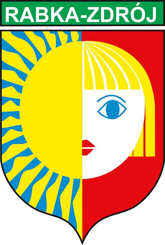 Nad tarczą herbową w zielonym prostokącie o proporcjach (wysokości do szerokości)- 1,0: 6,4, znajduje się drukowany zapis RABKA-ZDRÓJ.